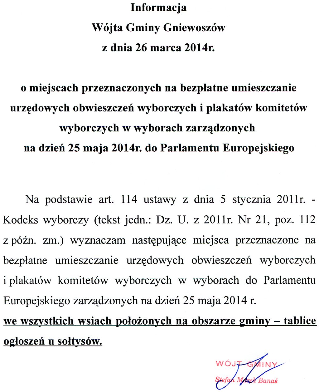 - wyborców nigdzie niezamieszkałych lub przebywających czasowo na obszarze Gminy Gniewoszów w okresie obejmującym dzień wyborów do Parlamentu Europejskiego zarządzonych na dzień 25 maja 2014r.
